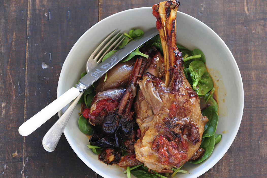 Зʼєднайте вміст обох сковорідок, покладіть цілі очищені зубчики часника, вино та чорнослив.