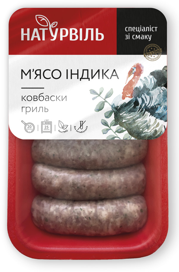 М'ясо індика, сало свиняче, натуральна оболонка (черева свиняча), вода, сіль, спеції, антиоксиданти,стабілізатори, підсилювач смаку.