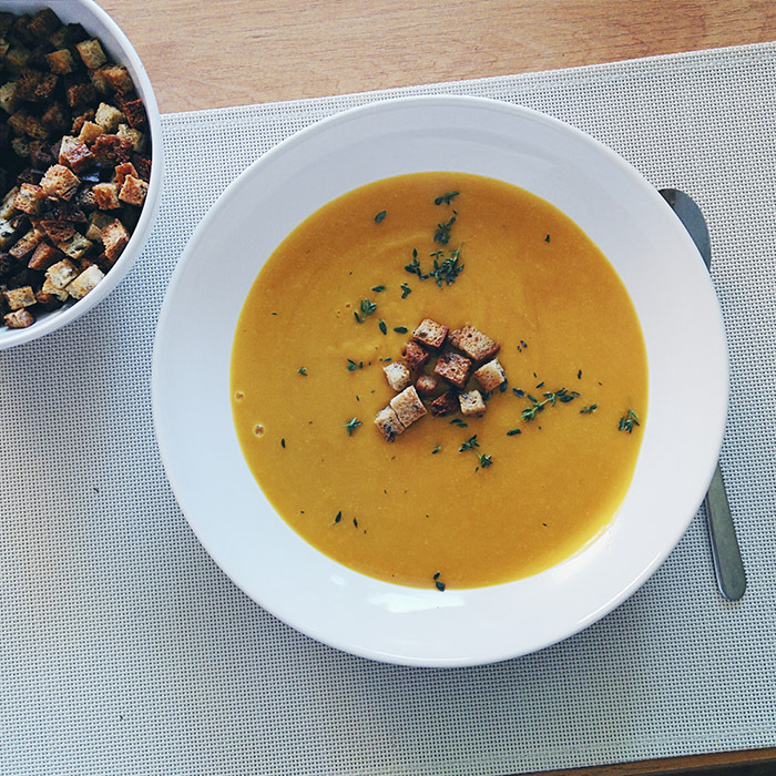 Підсушіть у духовці до хрумкого стану. Посипте готовими сухариками суп-пюре, або подайте їх окремо в невеликій мисочці.