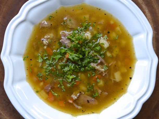 Шия індика — це оптимальна основа для приготування смачного та ароматного бульйону для овочевого супу. На ній є достатньо багато м'яса, тому страва виходить наваристою, але нежирною. Простий набір овочів додає бульйону смаку та робить його більш поживним. Томатна паста покращує колір супу й додає кислуваті нотки, а спеції ідеально доповнюють таку комбінацію продуктів.